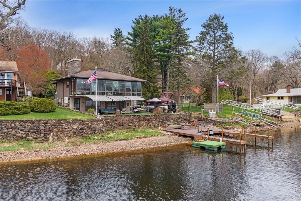 Unique opportunity to own a lakefront retreat on Lake Wickaboag. This residence offers direct water access, multiple docks and private boat ramp for effortless lakeside living. The main level welcomes you w/ lake views and rich wood flooring. An open-concept layout showcases an updated kitchen w/ s/s appliances, granite countertops, and a center island, flowing into the dining/living areas. A climate-controlled sunroom w/ expansive windows captures panoramic water views. Two spacious beds and a remodeled bath complete this level. The walkout LL offers versatility w/ a second kitchen featuring s/s appliances and a breakfast bar. The open living/dining...read more
